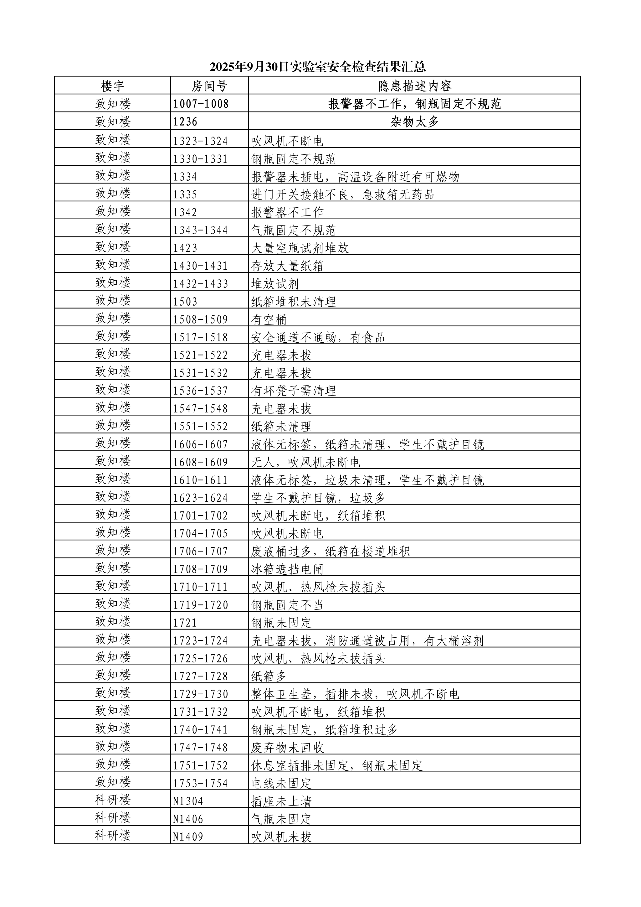 严军林对本次安全检查工作明确分组安排,指定负责人对致知楼、化工楼、科研大楼中科研实验室、教学实验室、公共区域逐一进行检查。检查中发现的主要问题有:报警器不工作、部分电器使用完不及时断电、气瓶固定不规范、纸箱杂物堆积等。针对发现的问题,检查人员对涉及学生现场告知并进行纠正。