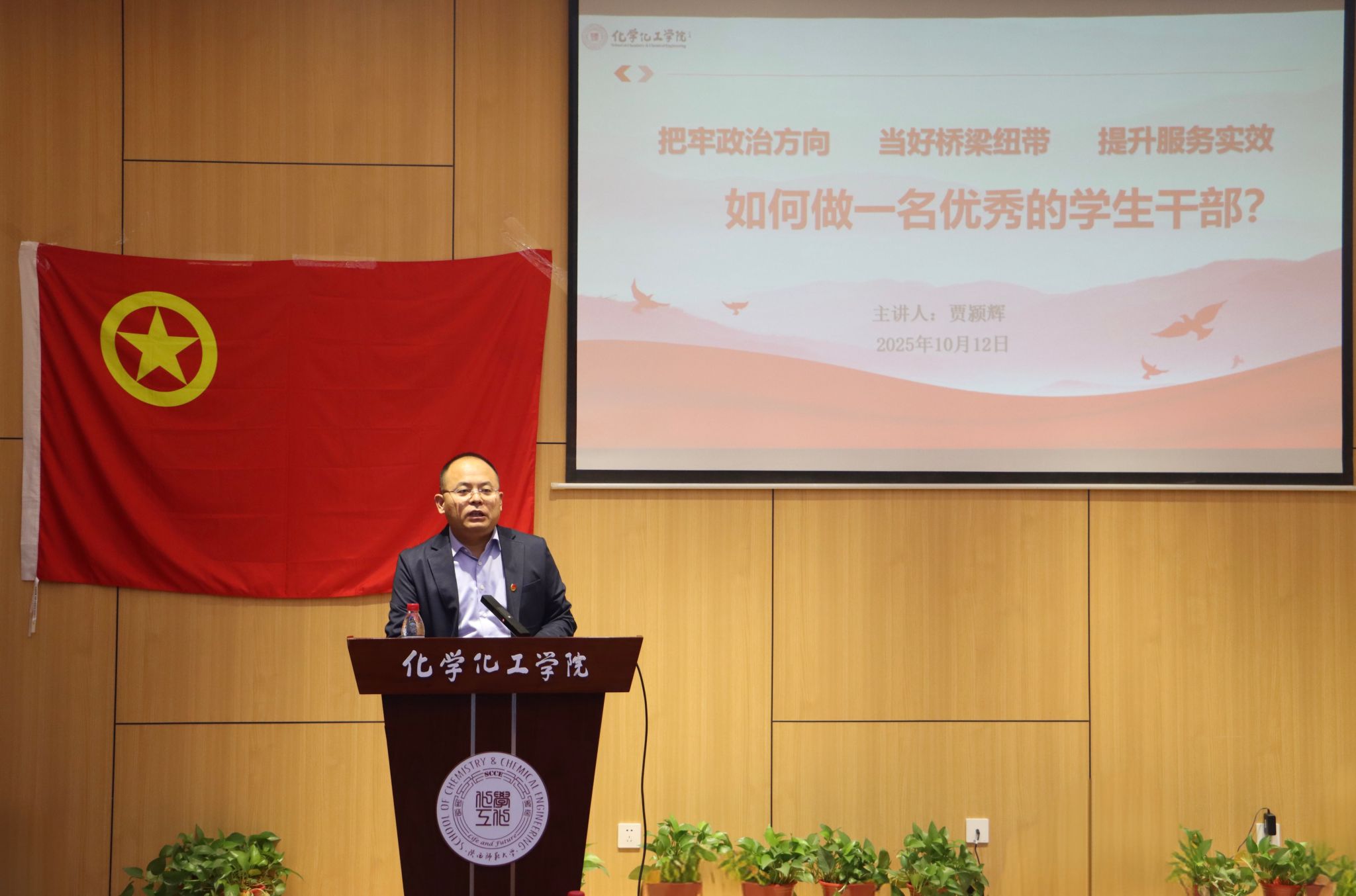 贾颍辉以《如何做一名优秀的学生干部》为题为新一届学生干部作专题报告。他强调,学生干部身份不仅是一份荣誉,更是一份责任,学生干部经历是青年成长过程中的宝贵机遇。他要求全体学生干部永葆初心使命,在日常学习与工作中做到以下三点:一是要把牢政治方向,深刻认识学生组织的政治属性,加强理论学习,筑牢思想根基;二是要当好桥梁纽带,常态化了解并反映同学思想动态、普遍需求、突出困难,做好同学们普遍关心的政策宣讲和具体服务;三是要提升服务实效,在各项活动组织中发挥组织协调和引领作用,主动担当作为,展现学生干部的良好形象。