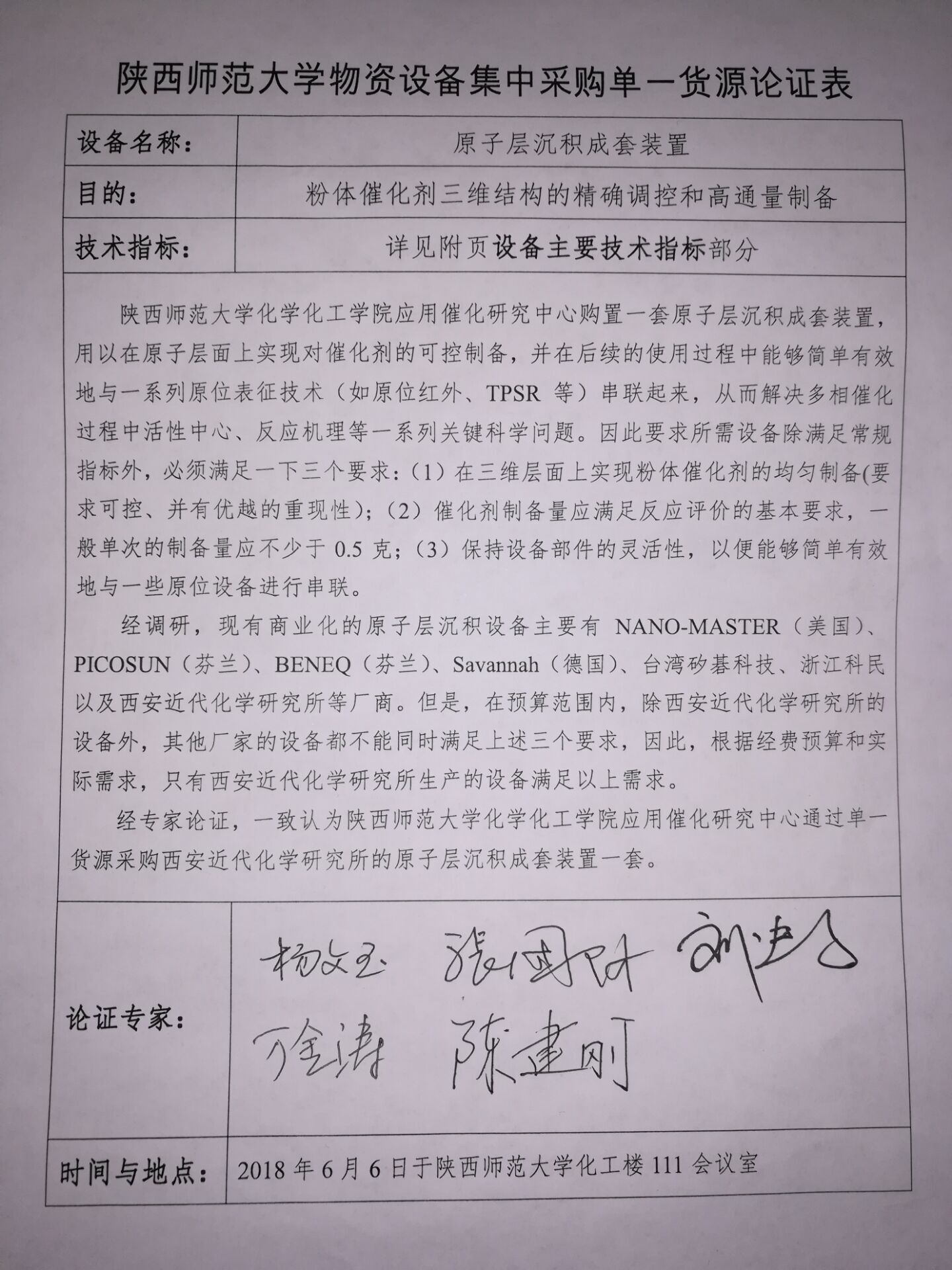 应用催化研究中心通过单一货源采购西安近代化学研究所的原子层沉积成套装置一套。