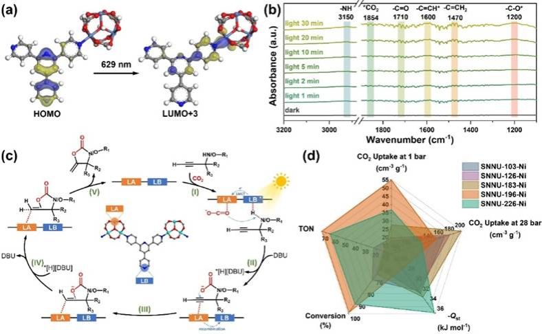 TD-DFT计算揭示了psit-MOF中配体到金属的电荷转移(LMCT)路径。原位FT-IR实验证实了SNNU-196-Ni可同时活化CO2与炔丙胺底物,产生中间体并逐步形成环化产物。XPS结果显示Ni 2p能级向低结合能移动,进一步证实LMCT及协同活化过程。基于此,提出了框架内Lewis酸/碱位点的协同吸附与活化机制,底物在光照与DBU助催化下完成脱氢、加成与环化反应。综合性能对比结果表明,SNNU-196-Ni在CO2捕集与转化中表现最优,验证了LGS-PSP策略通过调控孔径与活性位分布以实现高效CO2利用方面的独特优势。