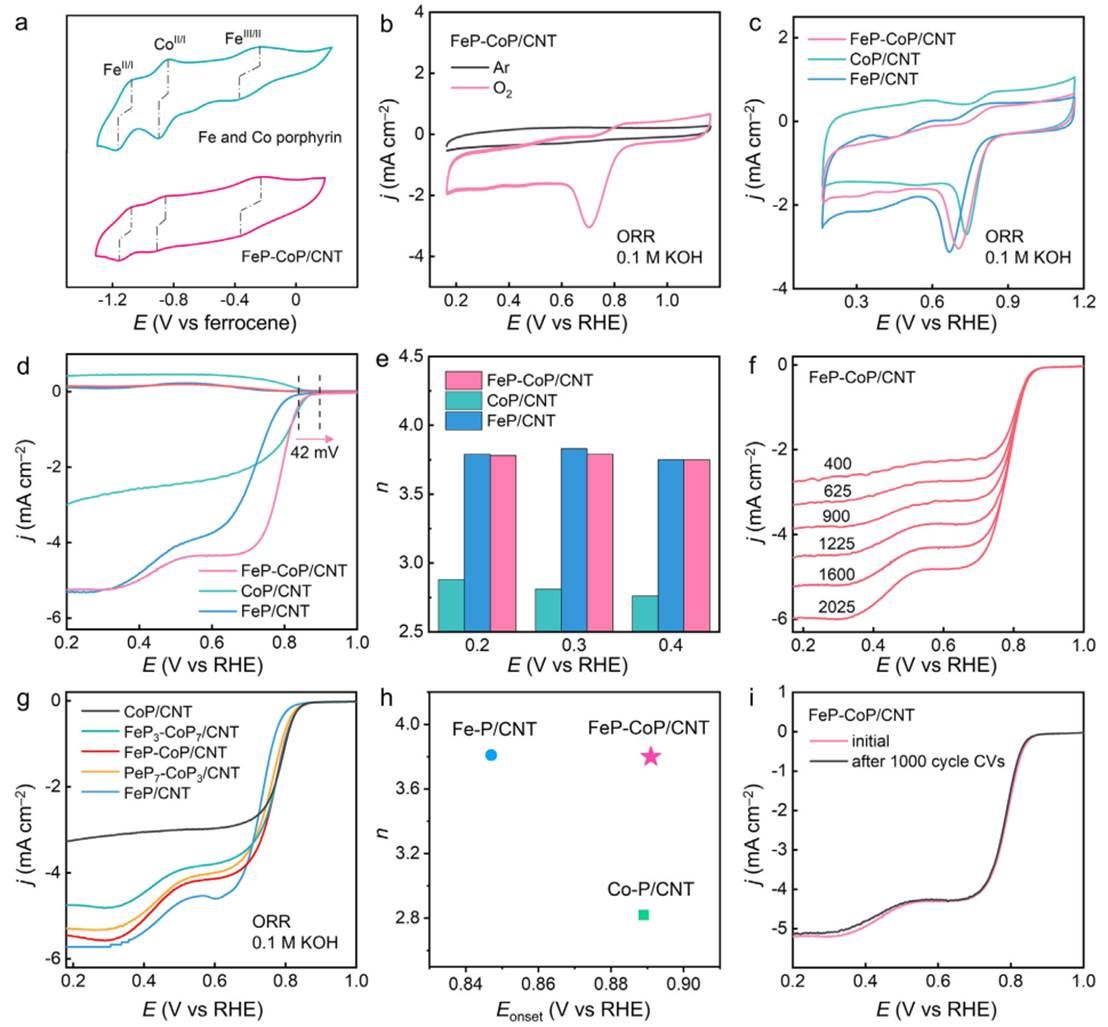 图3. FeP‑CoP/CNT及参比样品的电化学性能。a) FeP‑CoP/CNT和FeP与CoP分子混合物在DMF溶液中的CV曲线。b) FeP‑CoP/CNT在氩气或O₂饱和的0.1 M KOH中的CV曲线。c) CoP/CNT、FeP/CNT和FeP‑CoP/CNT在O₂饱和的0.1 M KOH中的CV曲线。d) CoP/CNT、FeP/CNT和FeP‑CoP/CNT在O₂饱和的0.1 M KOH中的RRDE测量结果。e) 利用RRDE得出的电子转移数。f) FeP‑CoP/CNT在不同转速下的LSV曲线。g) FeP‑CoP/CNT及参比样品的LSV曲线。h) FeP‑CoP/CNT及参比样品的起始电位和电子转移数。i) FeP‑CoP/CNT经过1000次CV循环前后的LSV曲线。