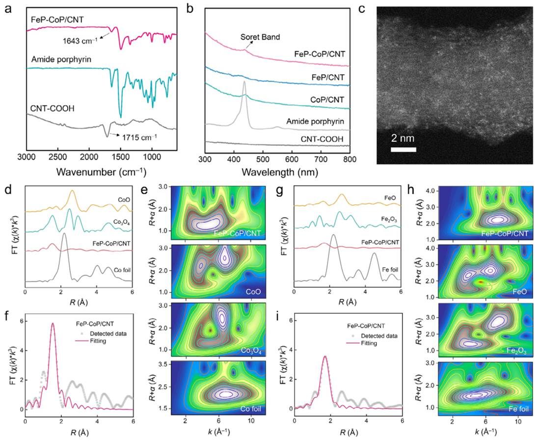 图2. 催化剂的结构表征。a) FeP‑CoP/CNT及参比样品的红外光谱。b) FeP‑CoP/CNT及参比样品的紫外-可见光谱。c) FeP‑CoP/CNT的高分辨率HAADF‑TEM图像。d) FeP‑CoP/CNT及参比样品的Co K边FT‑EXAFS谱图。e) FeP‑CoP/CNT的Co K边WT‑EXAFS图。f) FeP‑CoP/CNT的Co K边EXAFS在R空间的拟合分析。g) Fe K边FT‑EXAFS谱图。h) FeP‑CoP/CNT的Fe K边WT‑EXAFS图。i) FeP‑CoP/CNT的Fe K边EXAFS在R空间的拟合分析。