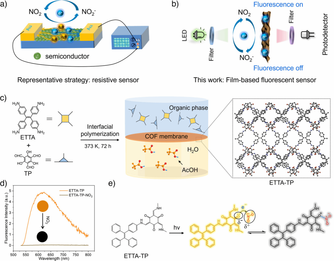 图 1. ETTA-TP COF膜的制备及其NO2响应机理